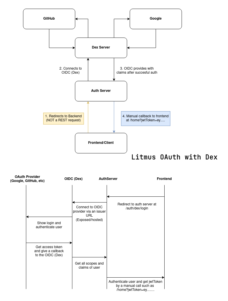 In order to provide enhanced and seamless login features, we wanted to integrate OAuth and other authentication mechanisms such as OpenID connect. To have flexibility, litmus-portal makes use of an additional component, Dex OIDC server.