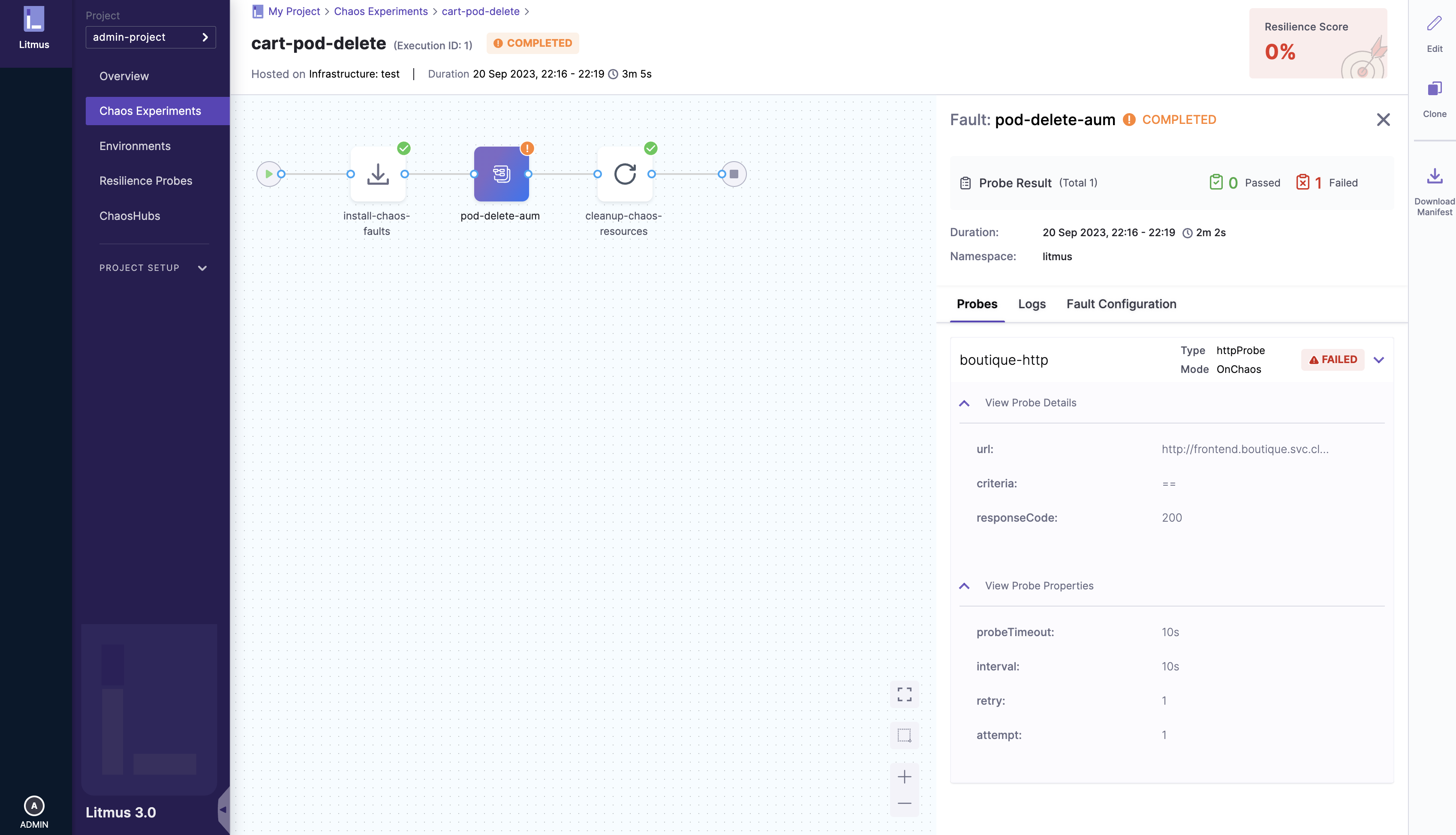 If the user chooses to Save and Run the experiment, they will be directed to the experiment execution page, where the experiment can be visualized. Otherwise, they will be taken to the chaos experiment page.