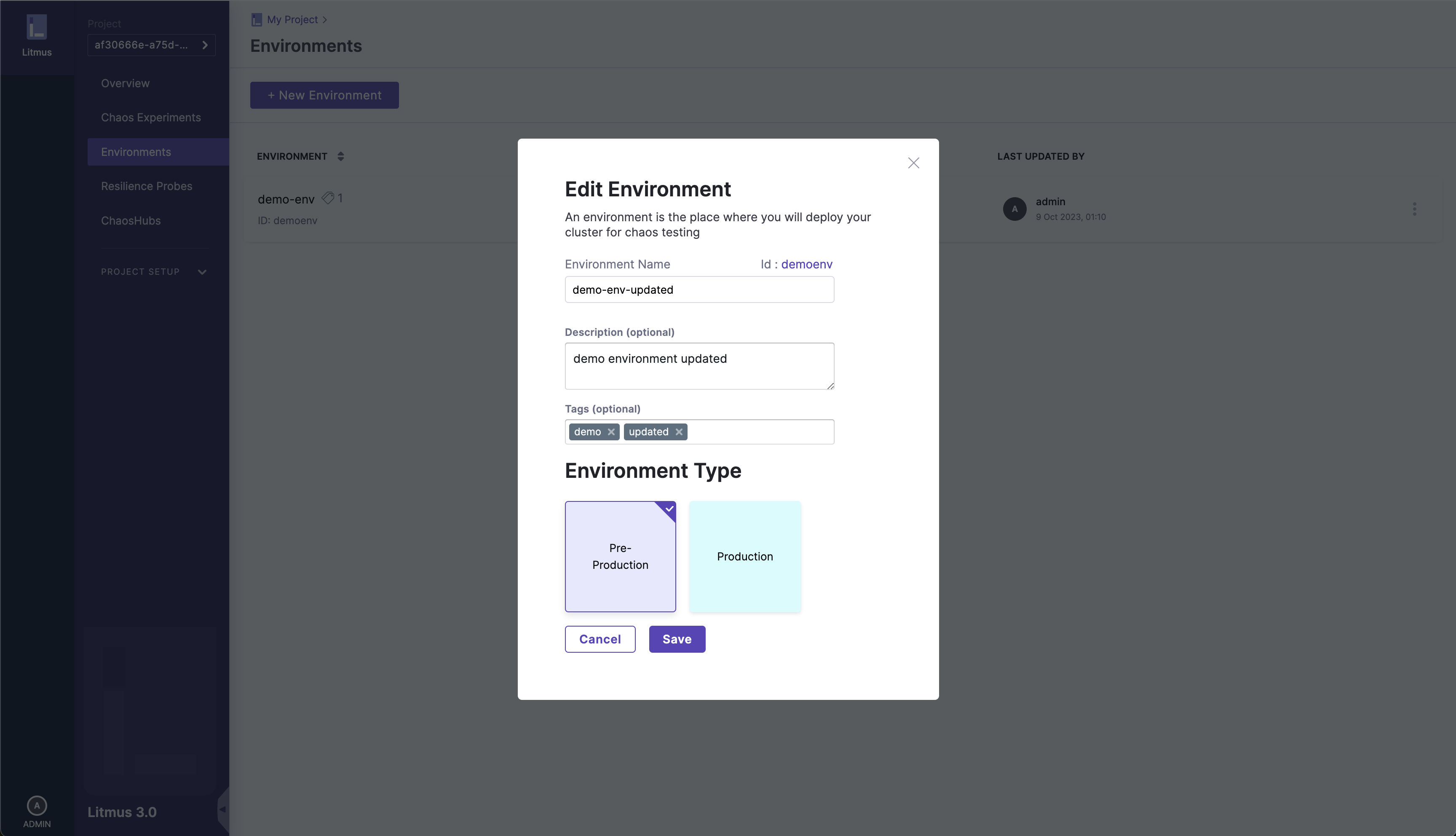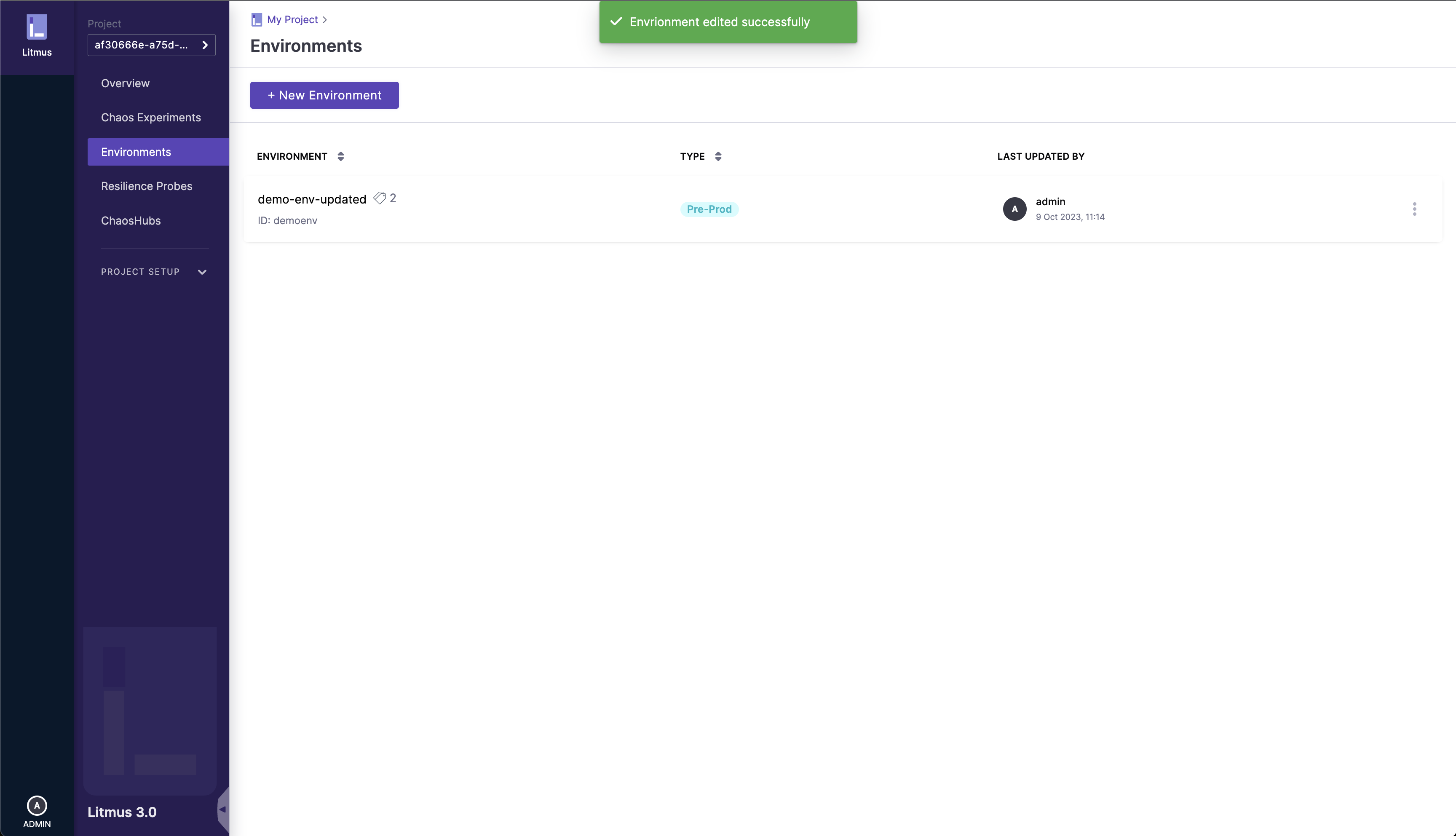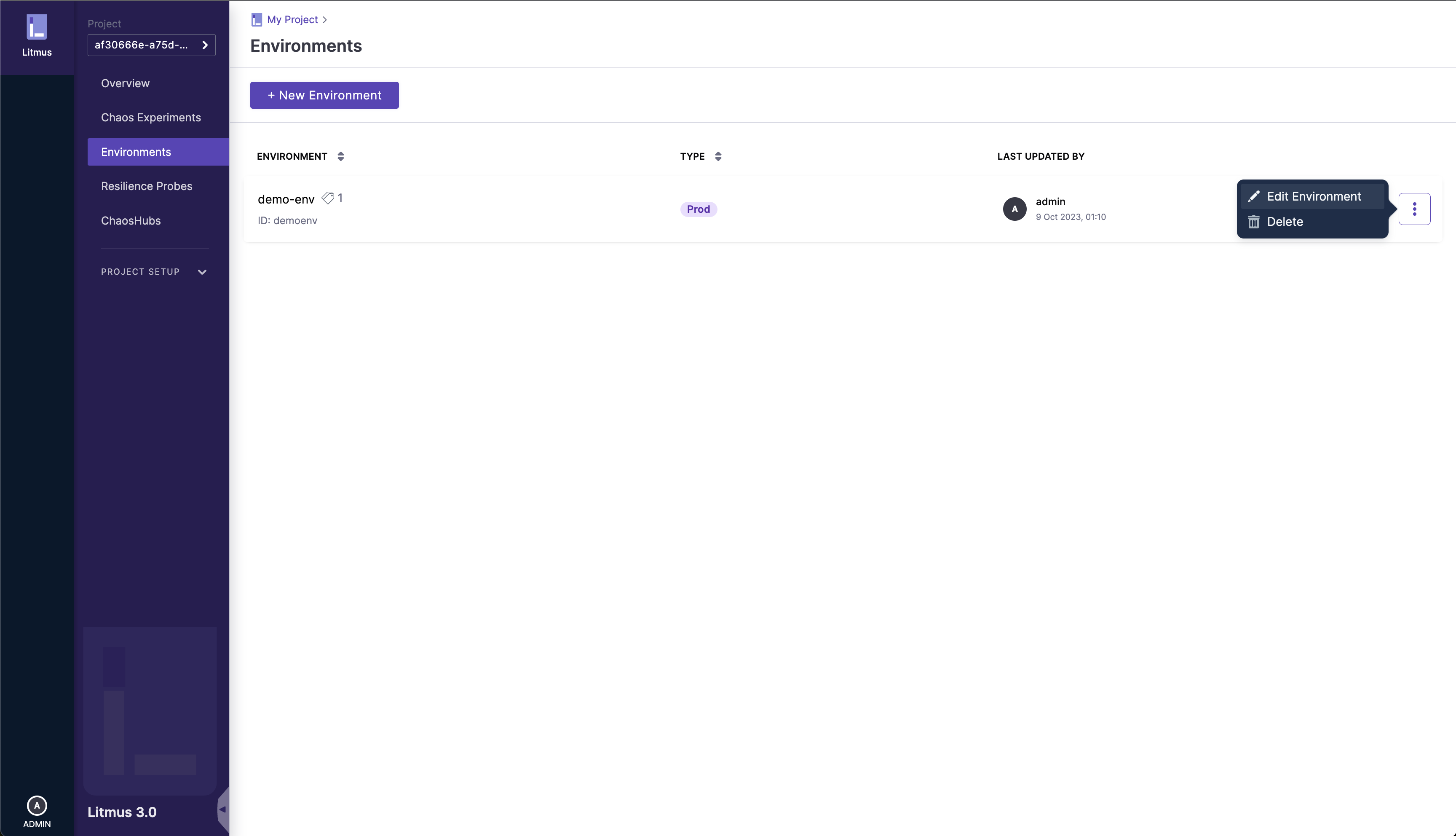 Navigate to the /environments page (Environments on the left nav), click on the options icon to open the options menu and select Edit Environment option: