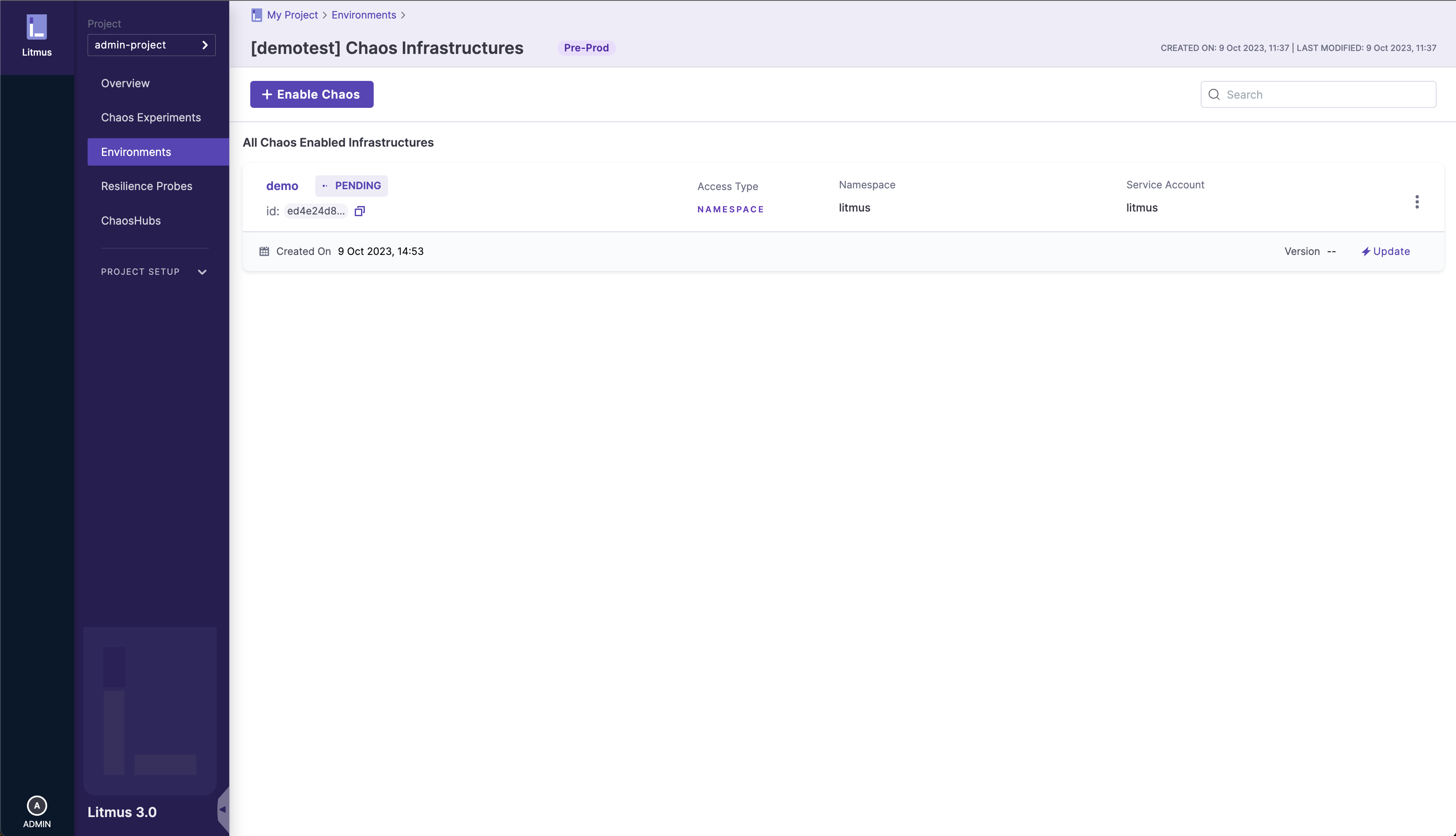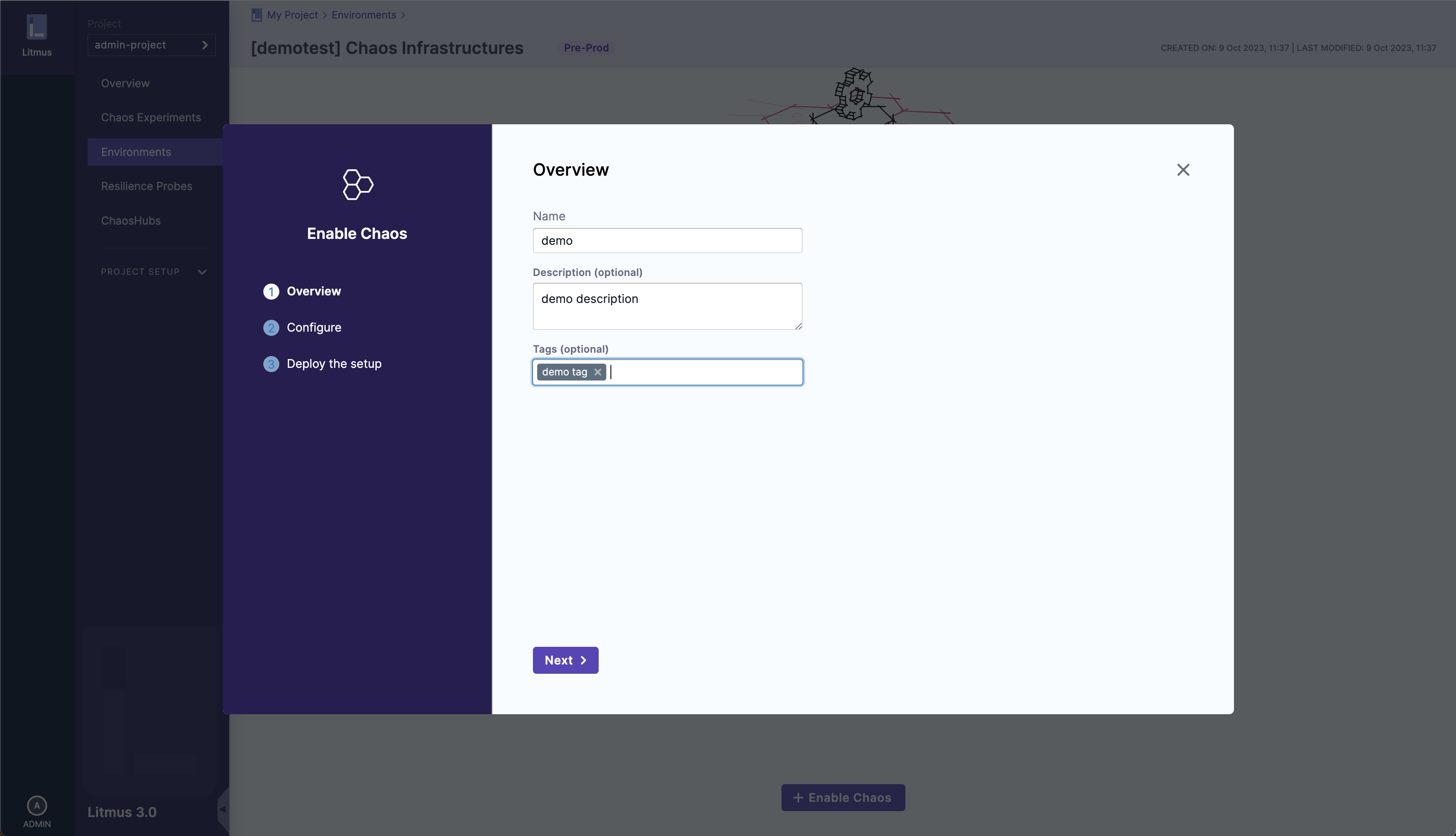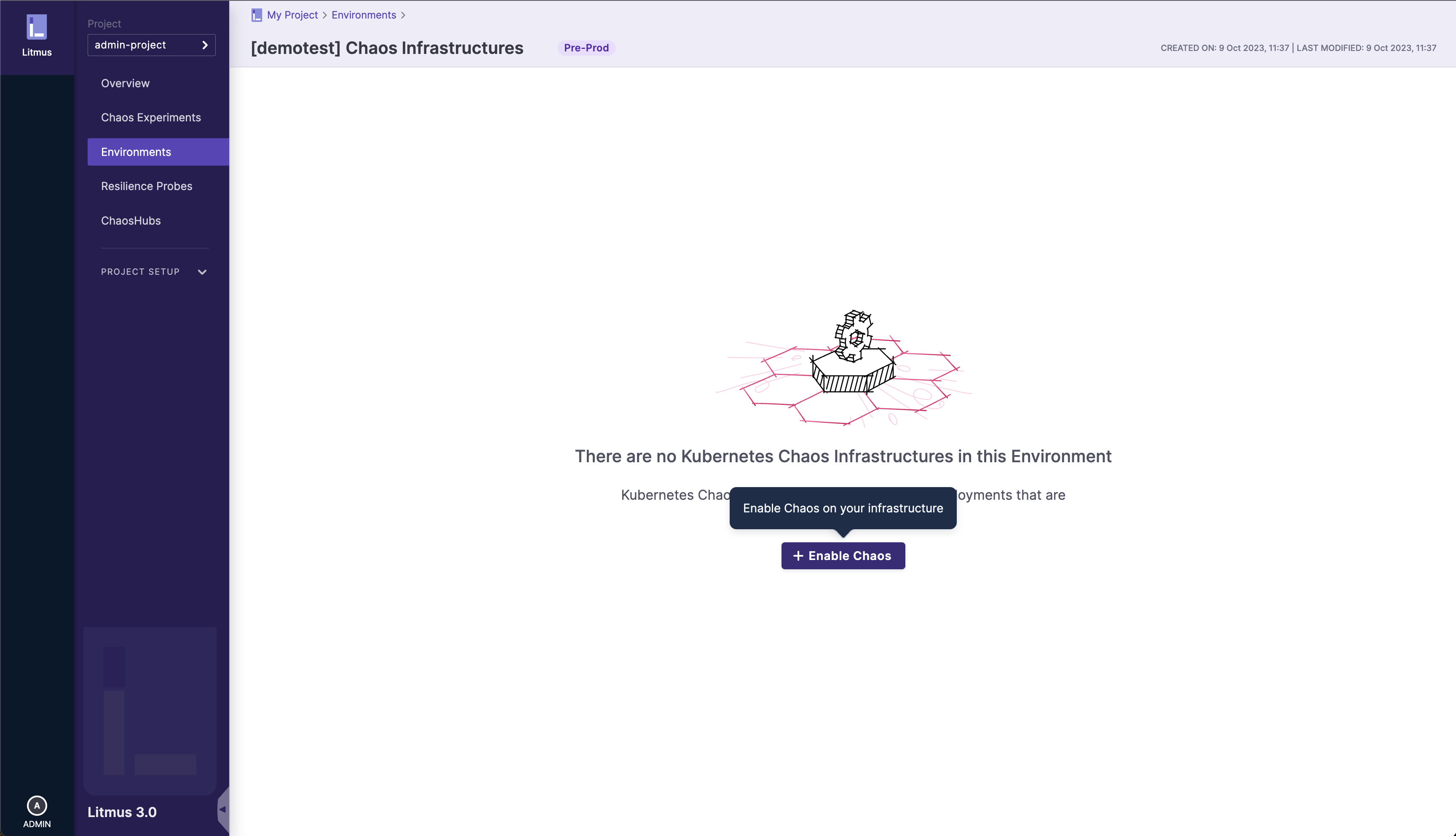 You will need to create an environment for your chaos infrastructure to reside within. Environments are an abstraction layer over infrastructures, and a detailed guide on the environment creation process can be found here