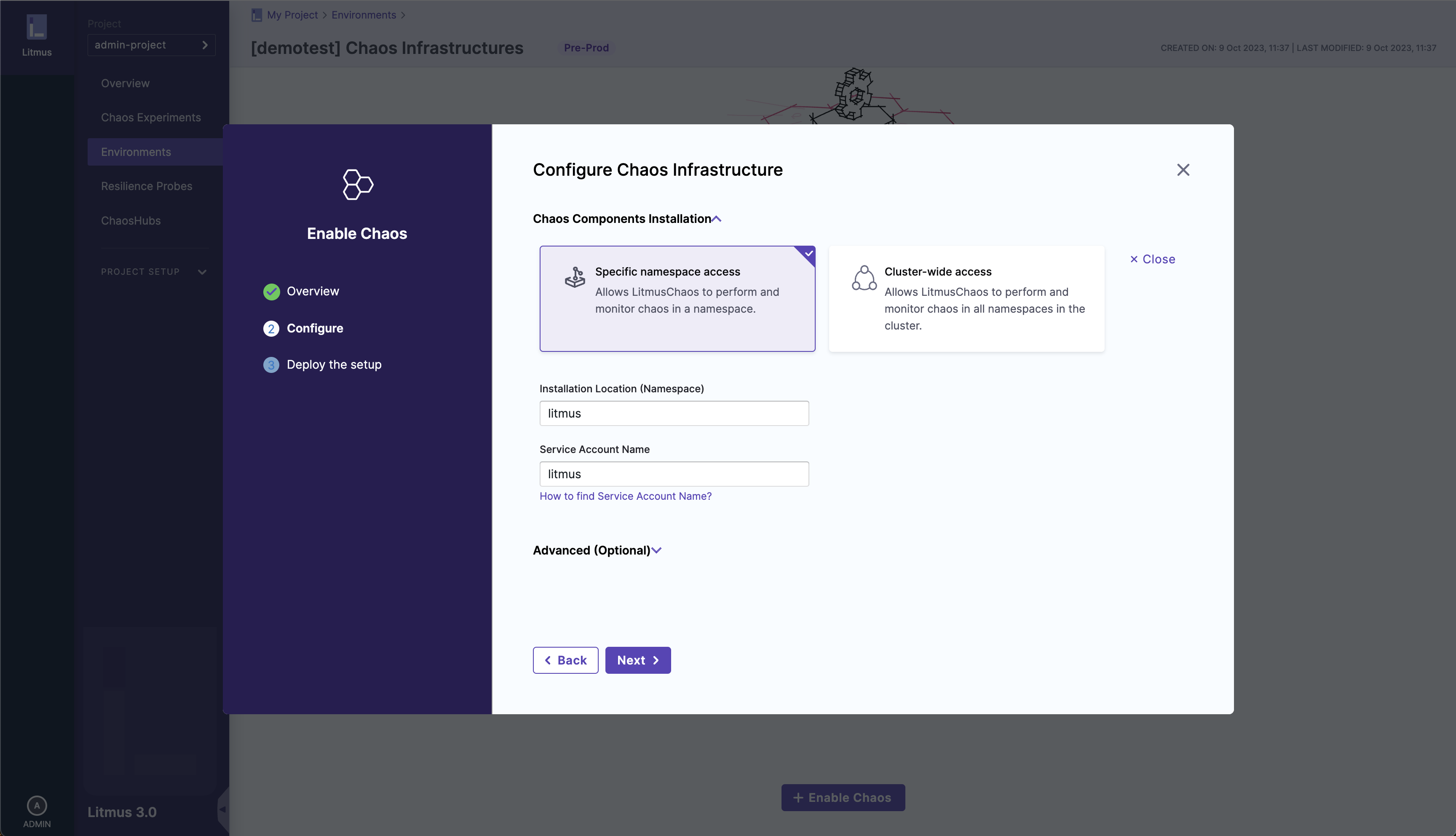 By default the installation will take place in the litmus namespace and uses litmus service account, which can be configured under the K8s cluster details.