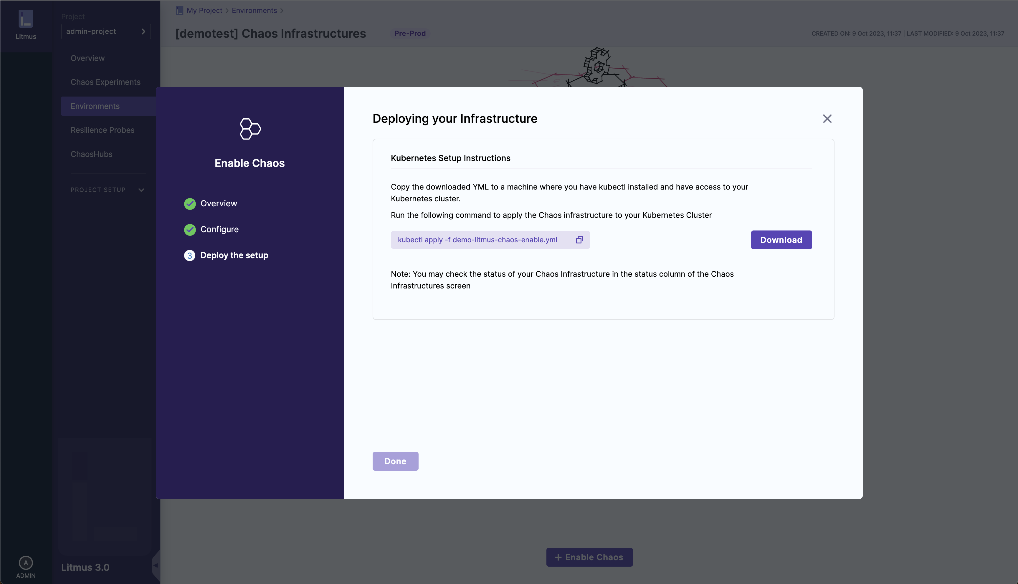 - Select Download, and then copy and run the kubectl command shown on your screen to install the chaos infrastructure.