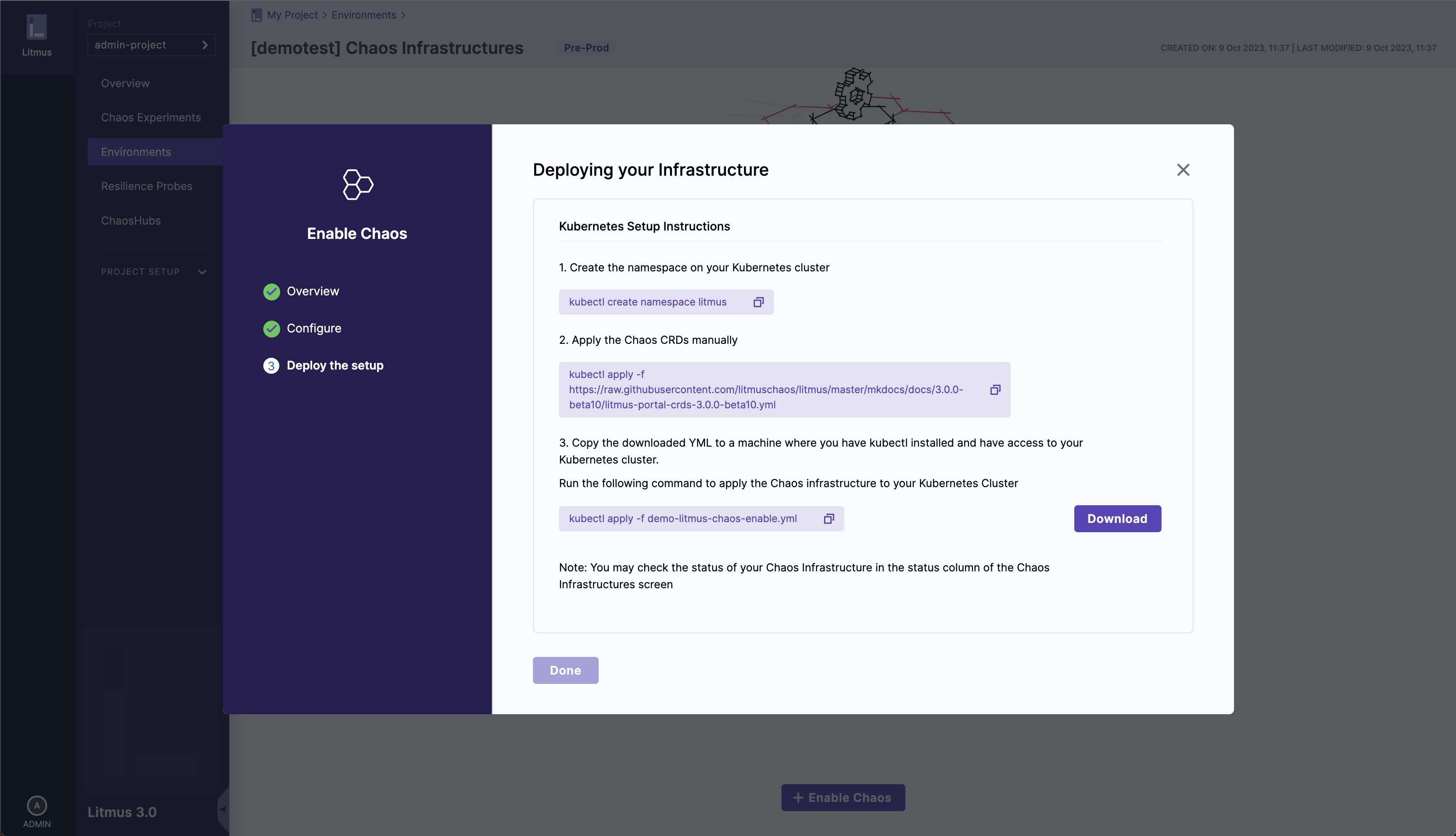 - Select Download, and then copy and run the third command to install the chaos infrastructure.