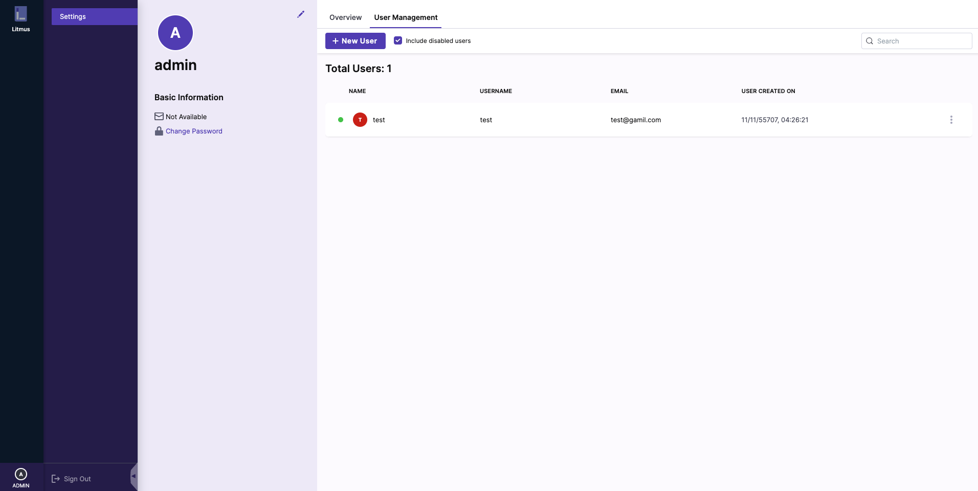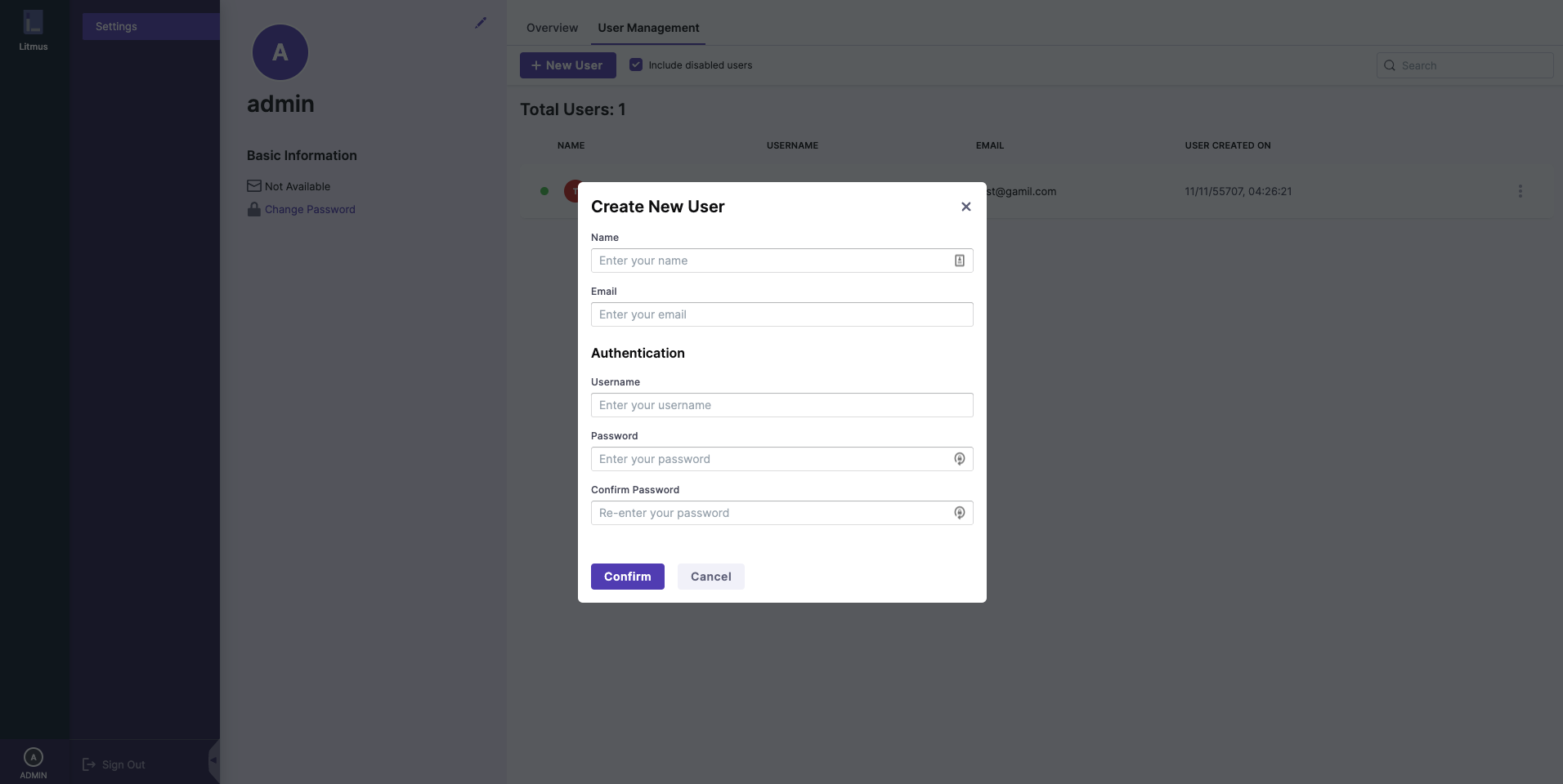 This feature enables the admin to create a new user by assigning a unique username and password for the user. In addition to this, the admin can also provide the name and email address of the new user which is optional.