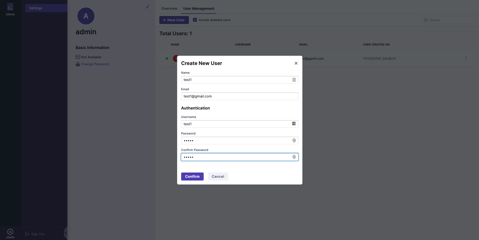 After you have added the details of the new user to be created, click the Confirm button to create the new user.